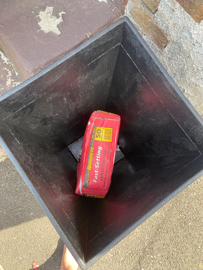 To prevent the planter from tipping over from wind, I added an old concrete block that we had in our garage. This bag of concrete had previously been wet and hardened in the bag - making it a perfect weight!